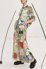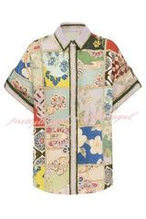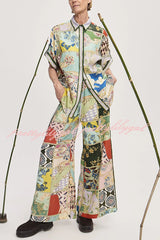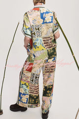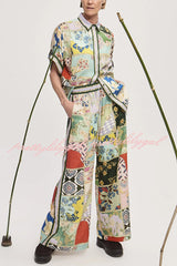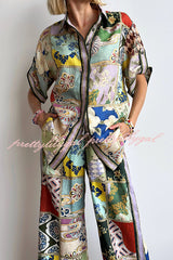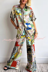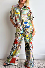 Linen Blend Lapel Short Sleeve Loose Top and Elastic Waist Casual Pocket Wide Leg Pants Set