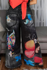 Butterfly Print Casual Elastic Waist Pocket Faux Denim Straight-Leg Pants