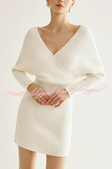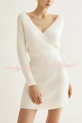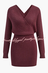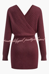 Solid Color Crossover V-neck Long-sleeved Fitted Waist Knit Mini Dress