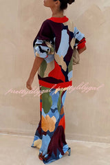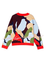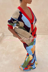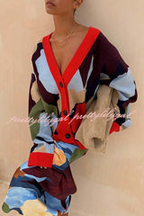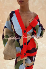 Bright and Bold Knit Abstract Color Blocks Button Long Sleeve Loose Cardigan
