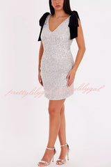 Sparkle and Elegance Sequin Velvet Bow Strap Detail V-neck Mini Dress