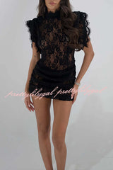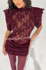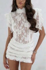 Bold and Alluring Lace High Neck Statement Padded Shoulder Wide Sleeve Ruched Mini Dress