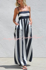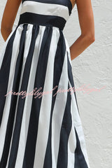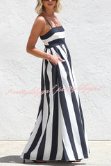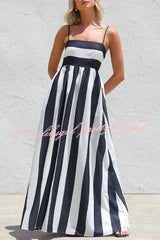 Color-blocked Striped Print Square Neck Suspender Casual Pocket Maxi Dress