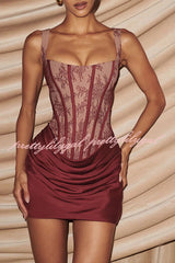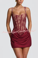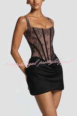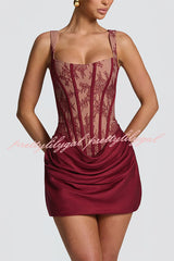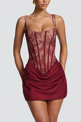 - This lace Cornelia mini dress features a floral-patterned corset design, a square neckline, a low waist, and a contrasting draped skirt with deep pleats. A back tie cinches the waist for an elegant and sophisticated silhouette.Our distinctive clothing will add instant style to your wardrobe.