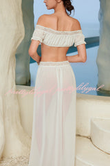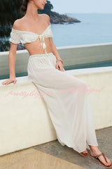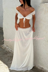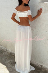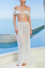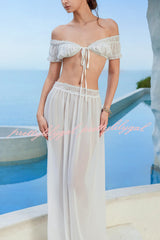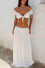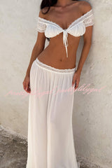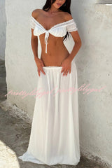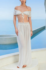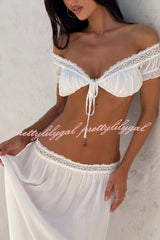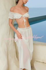 Sexy Off-shoulder Short-sleeved Tie-front Top and Casual Sheer Lace-trimmed Maxi Skirt Cover-up Set