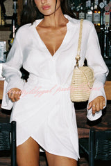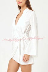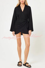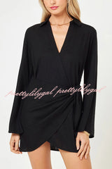 Solid Color Casual Long-sleeved V-neck Tie Waist Mini Dress