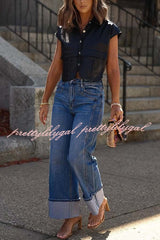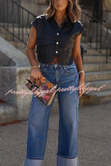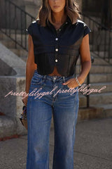 Stylish Weekend Faux Leather Button Up Cape Sleeve Pocket Crop Top