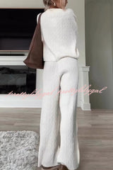 Autumn Travel Knit Cable Long Sleeve Sweater and Elastic High Waist Wide Leg Pants Set