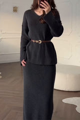 Solid Color Long-sleeved V-neck Casual Knitted Sweater and Elegant Maxi Skirt Set