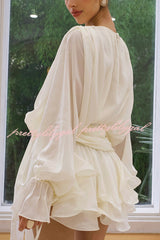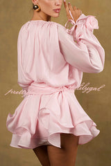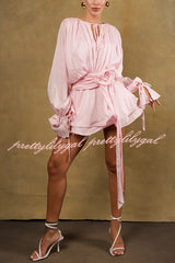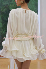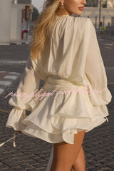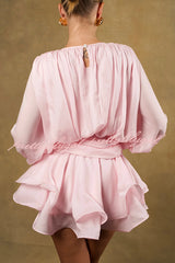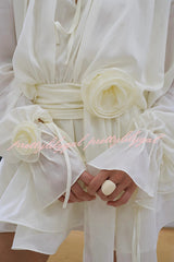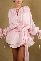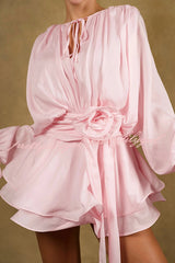 Solid Color Long Sleeve V-Neck Lace-Up Elegant Flower Decorated Mini Dress