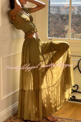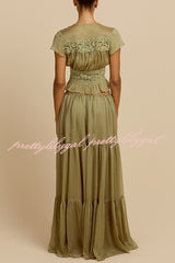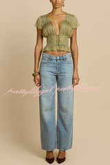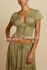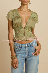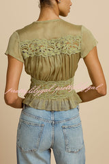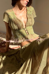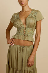 - Sabrina's top features a retro silhouette, crafted from a lightweight, pistachio green chiffon fabric. The deep V-neck and soft pleats at the bust perfectly accentuate the alluring collarbone. Short, ruffled sleeves add a touch of femininity, while a fitted lace bustier outlines a slender waist. The hem is gathered with delicate ruffles, further enhancing its graceful appearance. A matching button at the center front adds a touch of sophistication, and the pleated chiffon drapes naturally over the bustier.Our distinctive clothing will add instant style to your wardrobe.