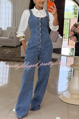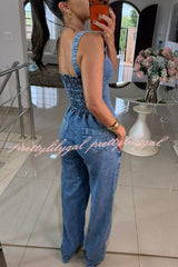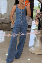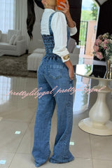 Heidi Denim Square Neck Button Back Smocked Pocket Flare Stretch Jumpsuit
