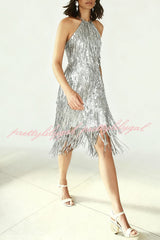 Sexy Sleeveless Halter Neck Tassel Sequin Mini Dress