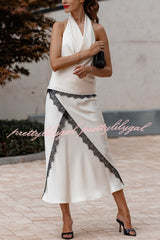 Iriena Satin Lace Trim Cowl Halter Neck Tank and Mid Rise Midi Skirt Set