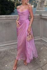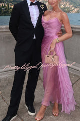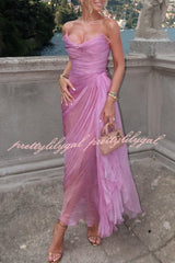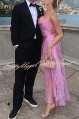 Julie Tulle Lace Trim Off Shoulder Ruched Back Lace-up Drape Slit Maxi Dress