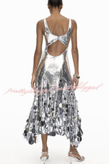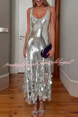 Party Tips Sequin Irregular Round Tassels Hem Back Cutout Tank Maxi Dress