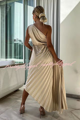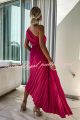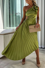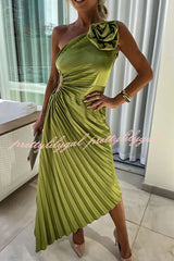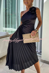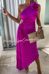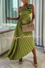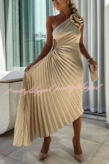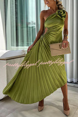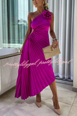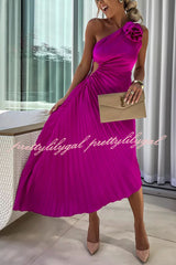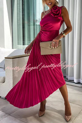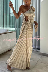 Romantic Nights Satin Raised Flower Elastic Cutout One Shoulder Pleated Maxi Dress