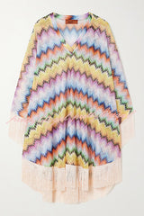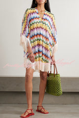 Jiya Knit Colorful Zigzag Pattern Tassle Trim Loose Kaftan Mini Dress