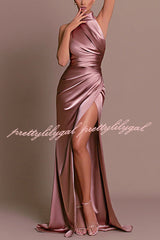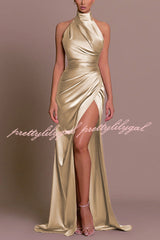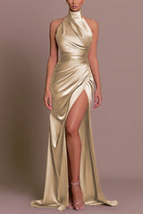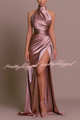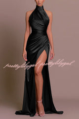 Satin Sexy Halter Neck Sleeveless High Slit Slim Maxi Dress
