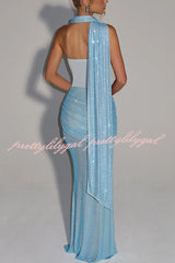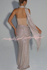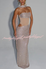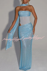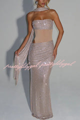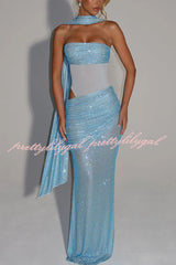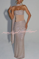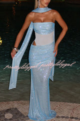 Kailani Sequin Strapless Mesh Cutout Waist Ruched Scarf Maxi Dress