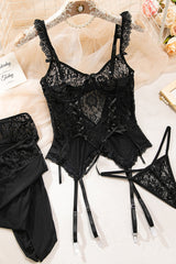 Fashionable Mesh and Lace Patchwork See-through Bra Set with Stockings