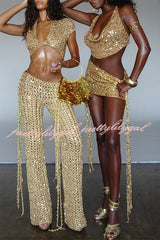Gold Coast Knit Sequin Fabric Cowl Halter Neck Crop Top and Adjustable Beaded Waist Mini Skirt Set
