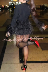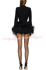 Party Time Feather Trim Design Deep Lapel V-Neck Long Sleeve Stretch Romper