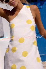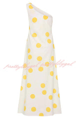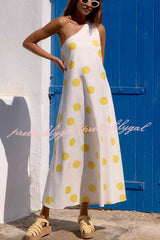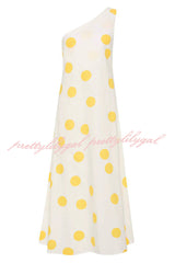 Sunlight Shines Linen Blend Colorblock Polka Dot Print One Shoulder A-line Maxi Dress